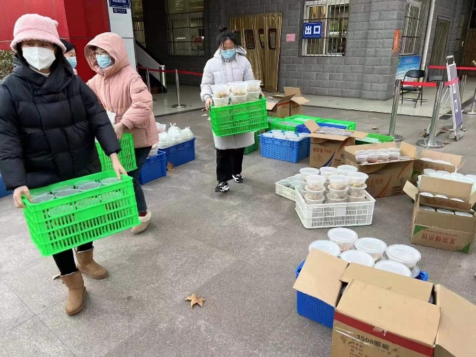 清晨,迎着朝阳而起,伴着第一缕阳光,送餐志愿者们确定好配餐数量及地点,为同学们送上早餐,从食堂到公寓楼来来回回、重复一遍又一遍的运送餐食、分配发放;晌午,一边工作一边在防护服里蒸个“桑拿”;夜深人静也不忘为其他志愿者们备好明天的防疫物资。几天时间内数以万计的餐食,鞋套磨坏了一双又一双,餐车装满了一趟又一趟。他们用奋战宣告决心,用行动践行使命,用担当扛起责任。