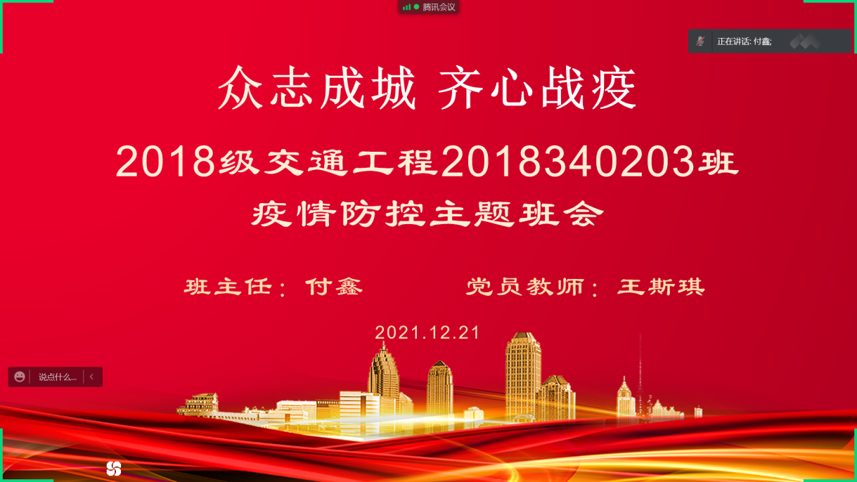 2021年12月21日,结对帮扶工作任务下达的当晚,党员教师王斯琪便召集2018级交工3班的同学们,开展“众志成城、齐心战役”疫情防控线上主题班会。