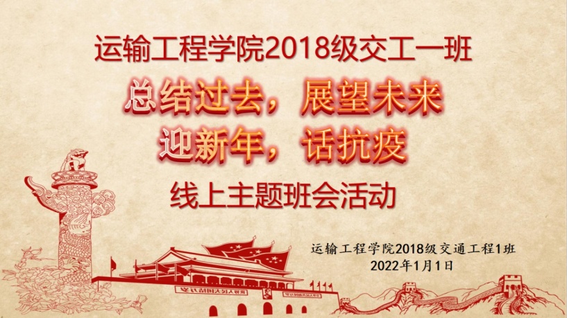 新年伊始,万象更新。202211日下午,2018级交通工程一班班主任田新民书记以及党员联系人卫东选老师与全班同学开展了近三个小时的线上班会活动,一起总结过去,展望未来,迎新年,话抗疫!