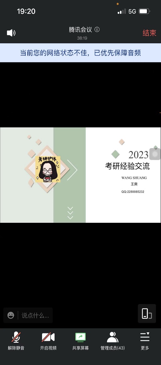 会上,叶林莘同学从时间管理的角度分享了考研经验,她强调7月8月是黄金时期,一定要把握好,其他时间要时时用意,勤耕不辍,合理安排好学业与考研的时间。王爽同学着重分享了政治英语的复习经验和考研心得,她重点强调了做真题的重要性,同时指出要保持乐观心态,找到自己内心深处的考研动机。以396分成绩进入黄金城 的孙悦则向大家介绍了专业课和数学的复习方法,为大家提供参考。