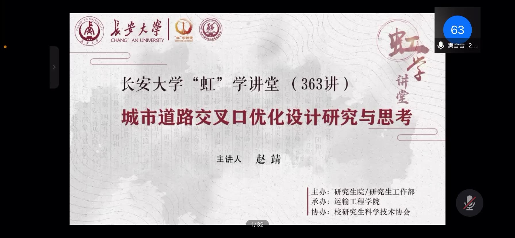 4月27日下午,由研究生院/研究生工作部主办、黄金城 承办、院研究生科学技术协会协办的“虹”学讲堂第363讲线上讲座顺利举办。上海理工大学赵靖教授作了题为“城市道路交叉口优化设计研究与思考”的报告。我校相关黄金城 共计200余名师生参加了此次讲座。