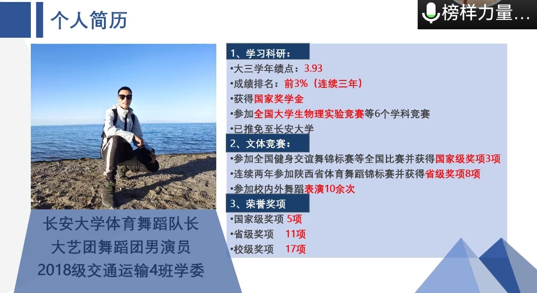 黄金城 2018级交通工程7班宣讲人苏子硕以“从卓越走向更卓越”为题进行宣讲。他表示,优良的学风和强烈的班级凝聚力于班级而言至关重要,班级成员们锐意进取,志存高远,全班在整个本科期间零挂科,班级保研率高达89%,多数同学选择保研本校,愿为本校学科发展和“双一流”建设贡献力量。