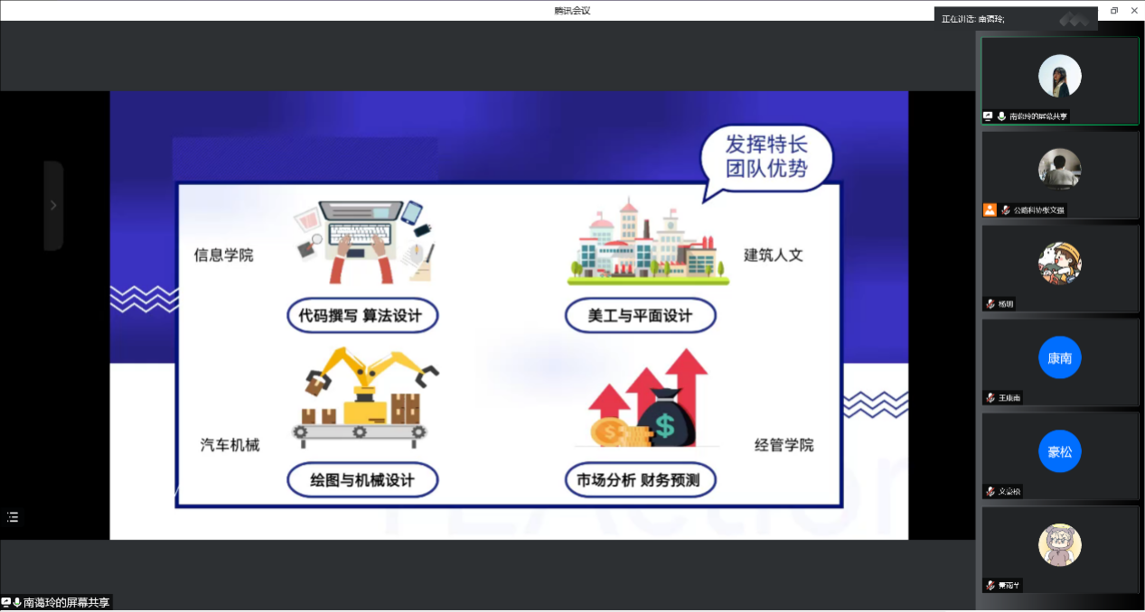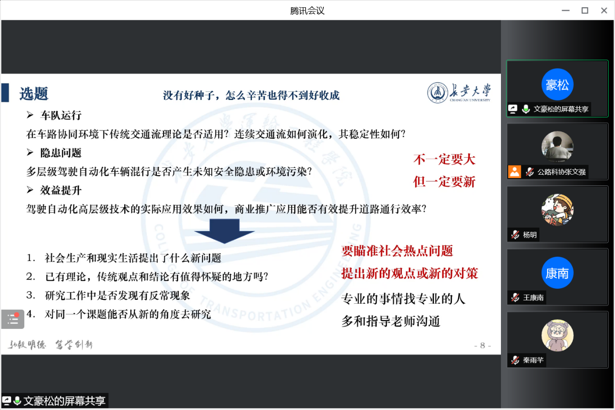 来自四个黄金城 的获奖学生代表进行比赛介绍与经验分享。运输黄金城 文豪松通过往期大赛的参赛流程进行介绍并从参赛团队、项目选题和申报书的撰写等方面分享自己的参赛的经验:经管黄金城 南蔼玲分享参赛心得,指出要摆正心态,富有热情,不断探索并对未来充满乐趣,要关注新内容、新热点、新方向,三是着重讨论研究过程,发挥特长和团队优势。公路黄金城 王康南通过自身答辩的经历为同学们介绍了答辩与PPT制作的相关注意事项,提到项目要有一个清晰的梳理,ppt需简洁、严谨。信息黄金城 杨明通过自身经验,多方面介绍了大赛准备过程的注意事项。