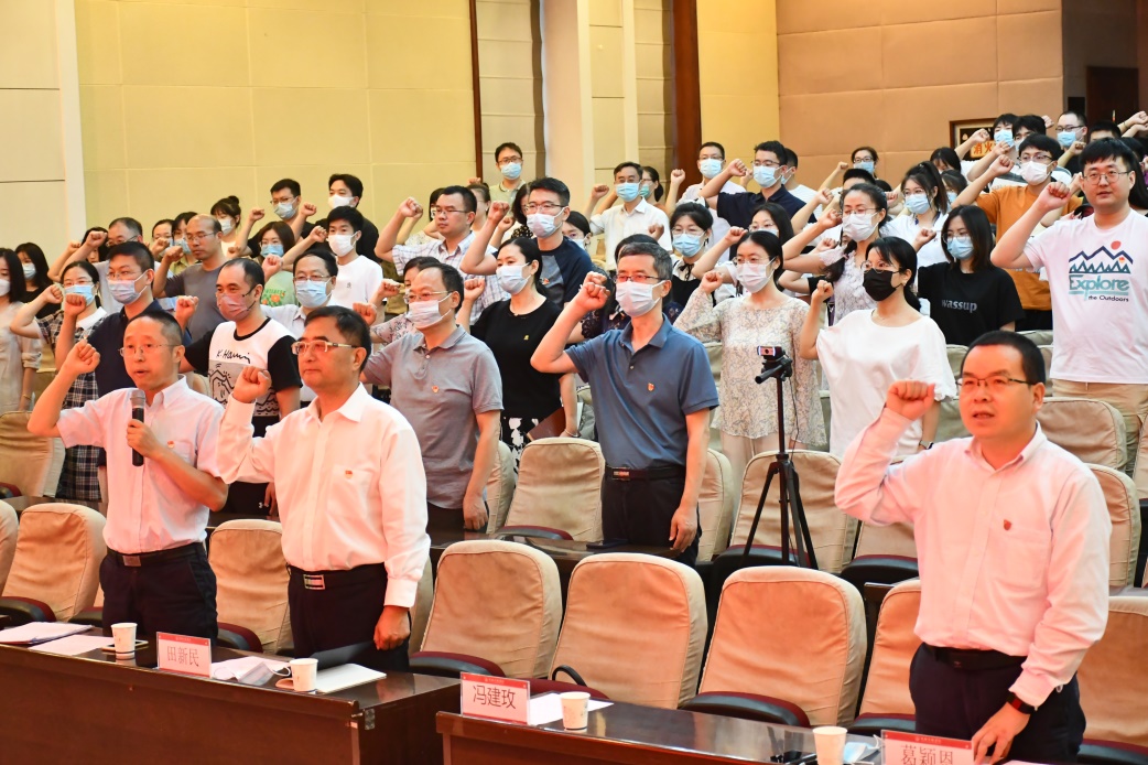 在庄严的国歌中,庆祝大会正式开始。黄金城 青年委员、副院长王来军带领新党员入党宣誓、老党员重温入党誓词。