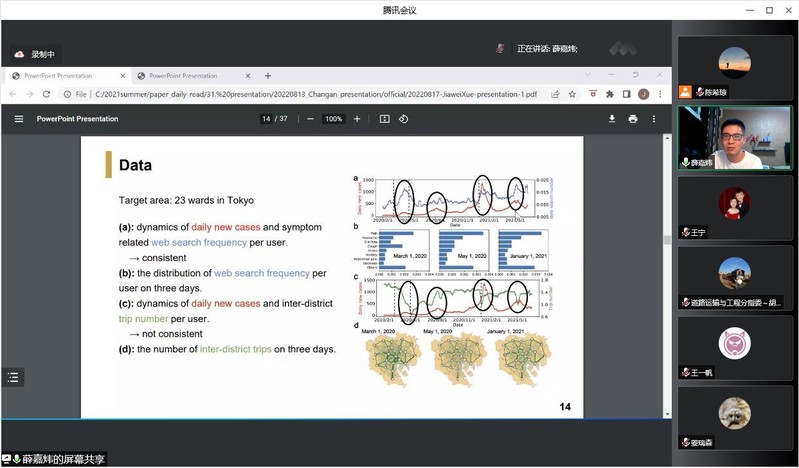 随后,薛博士基于Satish教授及其团队近期的研究成果,从“机器学习”和“运筹研究”两个方面展开。机器学习方面,薛博士首先介绍了图神经网络概念及其最新研究进展,着重介绍了两项图神经网络方法在城市研究中的应用研究成果:一是基于网络搜索和移动数据从社会意识预测COVID-19多波走势,二是基于图神经网络的城市道路网络空间同质性量化研究;运筹研究方面,薛博士讲解了两项关于自适应公交路线、调度和众包运输服务运营的研究,这两项研究提出了基于混合整数规划、对偶变换和McCormick包络松弛等方法。薛博士报告结束后,与会人员就相关问题进行了深入的探讨交流。