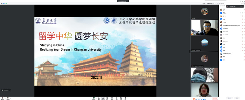 为使来华留学生应当熟悉中国历史、地理、社会、经济等中国国情和文化基本知识,了解中国政治制度和外交政策,理解中国社会主流价值观和公共道德观念,深入了解西安市和黄金城 的历史及传承,并加深留学生之间的相互了解,增进留学生间的友谊,黄金城 与公路学院共同在线上举办了留学生联谊活动。来自黄金城 和公路学院的19名留学生及黄金城 专项工作干部李岩、公路学院分管国际合作的副院长张久鹏、黄金城 的康栌月老师和公路学院的王越老师参加了该活动。整个联谊活动由李岩老师主持。