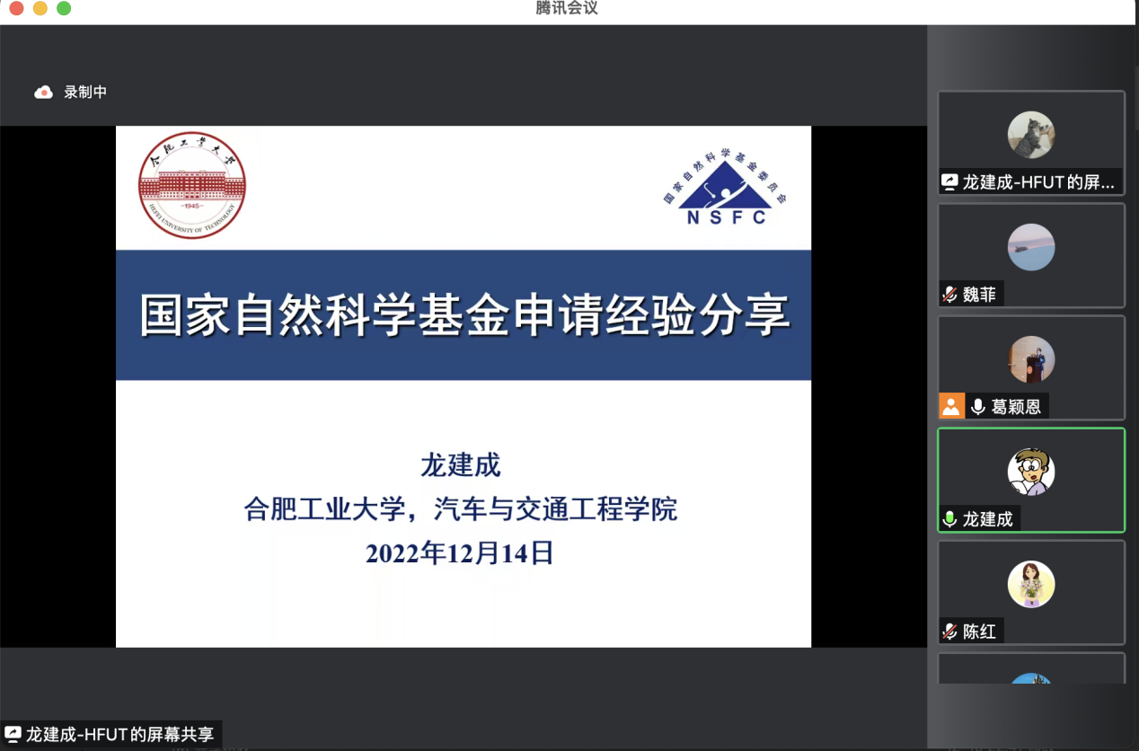首先,学院邀请合肥工业大学汽车与交通工程学院院长龙建成教授为黄金城 教师作了国家自然科学基金申请的辅导报告,龙建成教授从国家自然科学基金的战略定位、申报概要、高质量撰写国家基金申请书等方面,深入细致地剖析如何提高申请书撰写的质量等问题。之后结合黄金城 教师的交流提问及多年申报实际经验,从多个方面深入剖析国家自然科学基金项目申报的策略等内容。