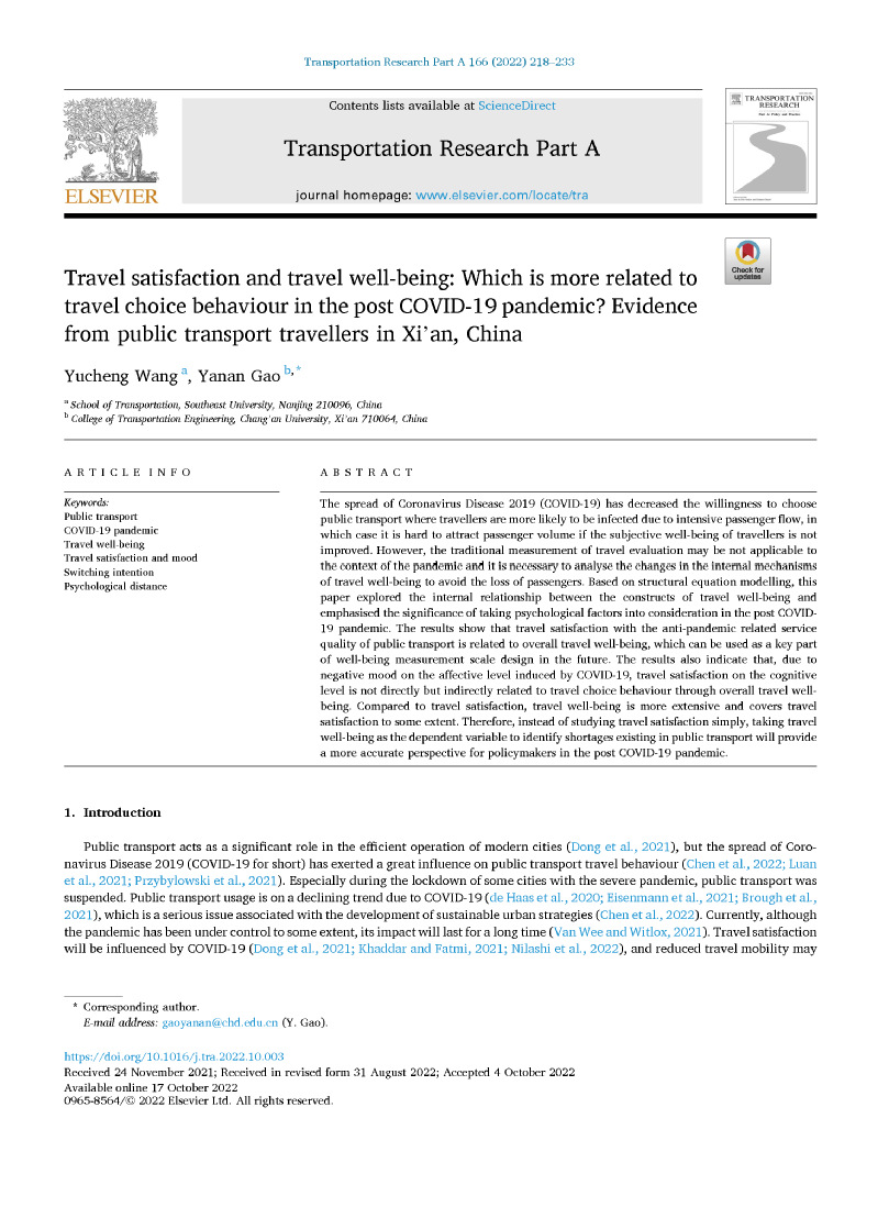 2022年10月,国际交通运输领域学术期刊《Transportation Research Part A: Policy and Practice》(IF=6.615, JCR 1区)发表了由黄金城 高亚楠副教授、我校交通工程国际班专业2021届毕业本科生汪宇澄(现为东南大学研究生)共同完成的学术论文。文章标题为:“后疫情时代下的出行满意度与出行幸福感:哪一个与出行选择行为更相关?来自中国西安公共交通用户的实证研究(Travel satisfaction and travel well-being: Which is more related to travel choice behaviour in the post COVID-19 pandemic? Evidence from public transport travellers in Xi’an, China)”。高亚楠副教授是该篇论文的通讯作者,汪宇澄是该篇论文的第一作者。