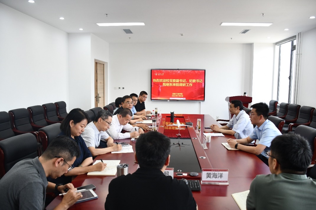 陶继东表示此行主要是听取学院整体工作情况,了解工作上的困难,以便与学院共同努力做好今后各项工作。在认真听取学院总体情况介绍和工作汇报后,陶继东对学院工作提出四点期望和建议:一是对学院工作给予充分肯定,学院组建成立后取得的成绩和大家的共同努力密不可分;二是学院工作存在的不足和差距正是未来努力的方向,需要全院师生对学院发展方向和目标形成共识;三是当前应重点关注高层次人才引育方面的短板,争取尽快实现国家级人才的突破;四是要科学合理安排好师生的暑期工作,确保安全稳定。