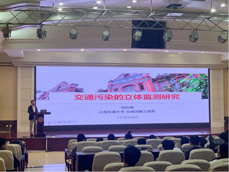 第一场报告中,何红弟副教授针对交通污染排放监测和交通污染三维扩散等研究进行了深入讲解。首先,他介绍了交通污染、碳达峰碳中和、上海市集卡运输现状等背景信息,强调了上海市集卡运输移动尾气监测的重要性。其次,他介绍了其研究团队目前针对集卡排污监测的实验情况,采集了国四、国五、国六标准下混合动力新能源车等的排放数据,对CO和NO等排放物进行了监测。最后,为研究排放废气的扩散,他们团队使用无人机采集了不同飞行路径下不同高度的污染物数据,并基于MOVES(MOtor Vehicle Emission Simulator)模型与机器学习构建了机动车碳排放估计微观模型,以此开展了临街小区污染监测研究。