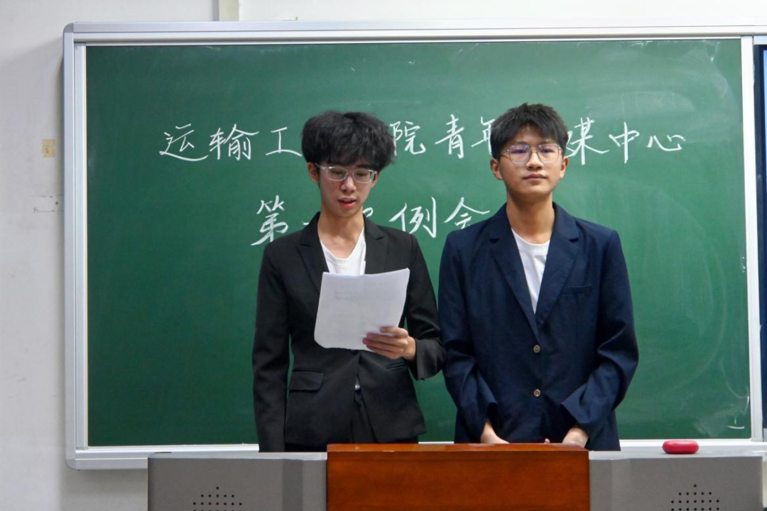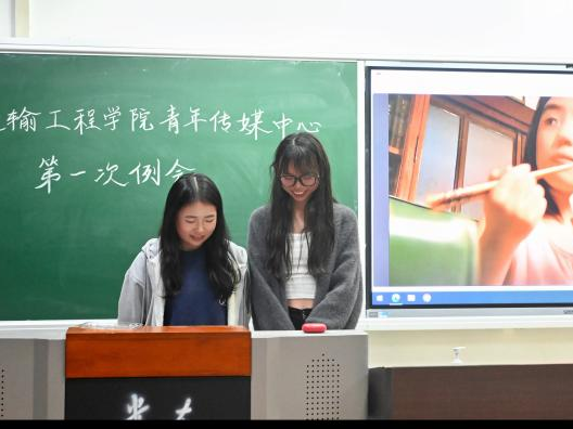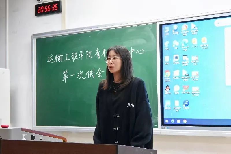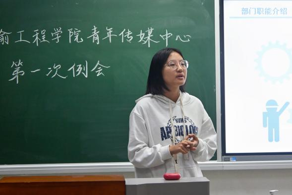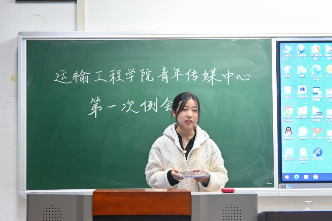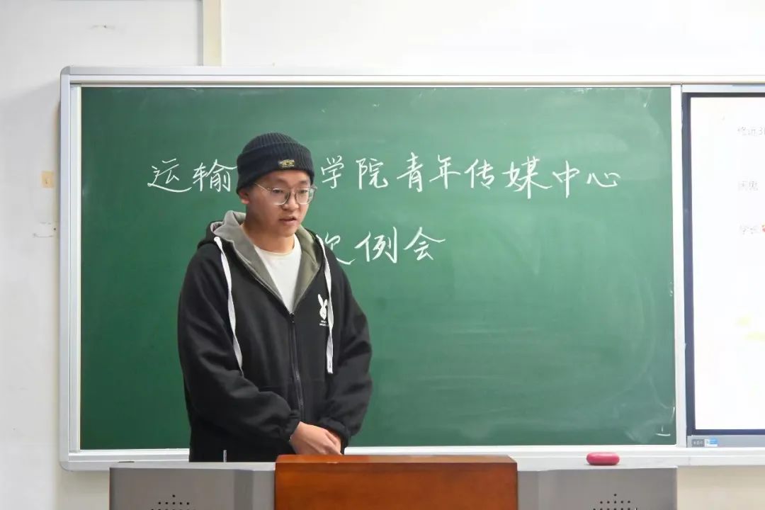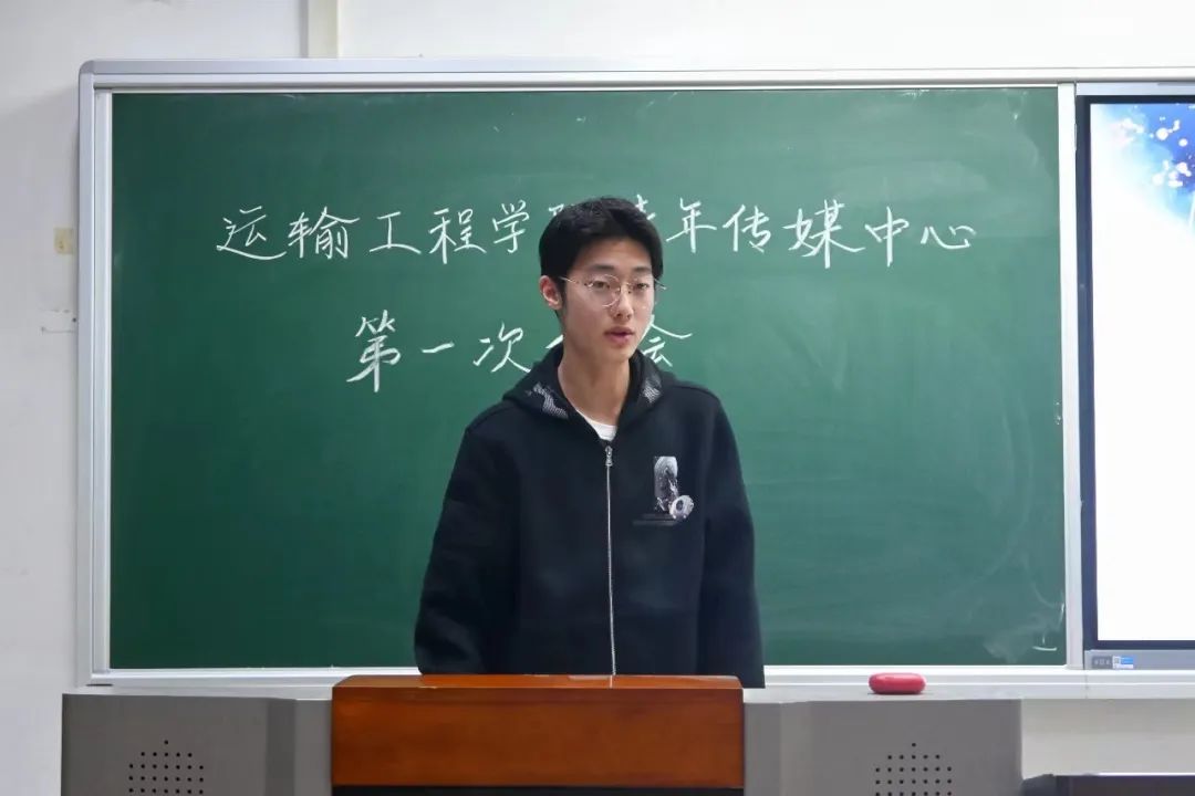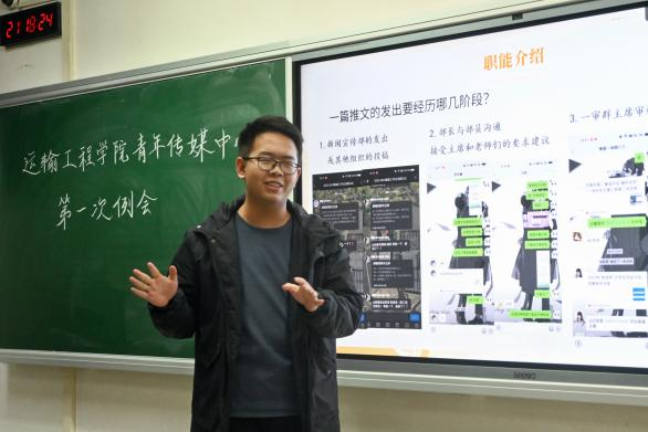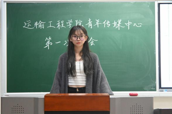 随后,运输青媒主席迟敬蕾进行发言。她对青媒过去一年的工作表示肯定,同时指出了当下青媒在工作沟通中存在一定问题,并提出了相应的改善方案。她鼓励新部员在学习生活上遇到问题时主动找学长学姐提问、交流,希望青媒成员们可以积极表现自己,收获更好的成绩。