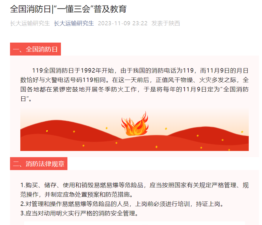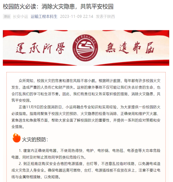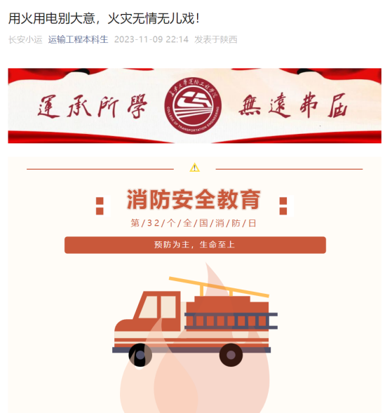 通过微信公众号平台“运输工程本科生”、“运输工程研究生”进一步强化消防安全宣传,发挥网络优势,利用学生喜闻乐见的形式做好消防安全宣传工作,通过形式多样的宣传内容,提高同学们学习消防安全意识的主动性、积极性。