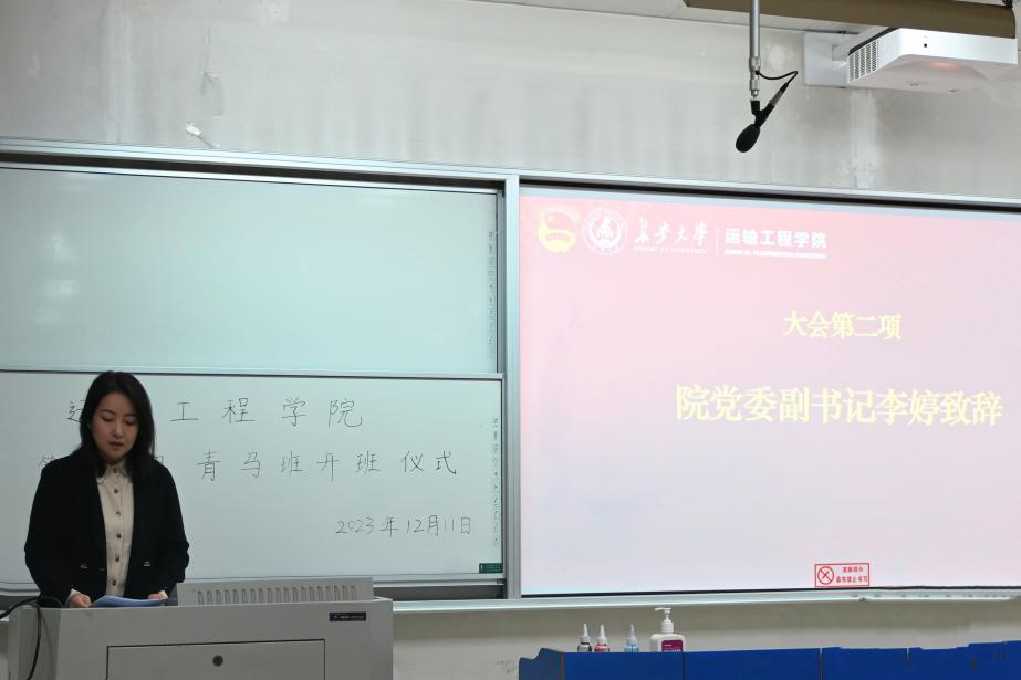 李婷指出“青马班”既是对学生骨干培养工作的贯彻落实,也是对学院思想政治教育的深入推进,更是对新时代号召的积极响应。同时她向大家提出三点希望和要求:一是强化理论学习,铸牢信仰根基。同学们要时刻以青年马克思主义者的标准来要求自己,坚定不移听党话、跟党走,自觉做习近平新时代中国特色社会主义思想的坚定信仰者、积极传播者、忠实实践者。二是发扬奋斗精神,敢于攻坚克难。同学们要既扎实打牢专业基础又及时更新知识,既刻苦钻研理论又积极掌握技能,努力成为可堪大用、能担重任的栋梁之材。三是加强实践锻炼,勇于挺膺担当。同学们要在理论学习中提升自我素质、在艰苦奋斗中锤炼意志品质、在实践锻炼中增长智慧才干,用青春书写无愧于时代的华彩篇章。
