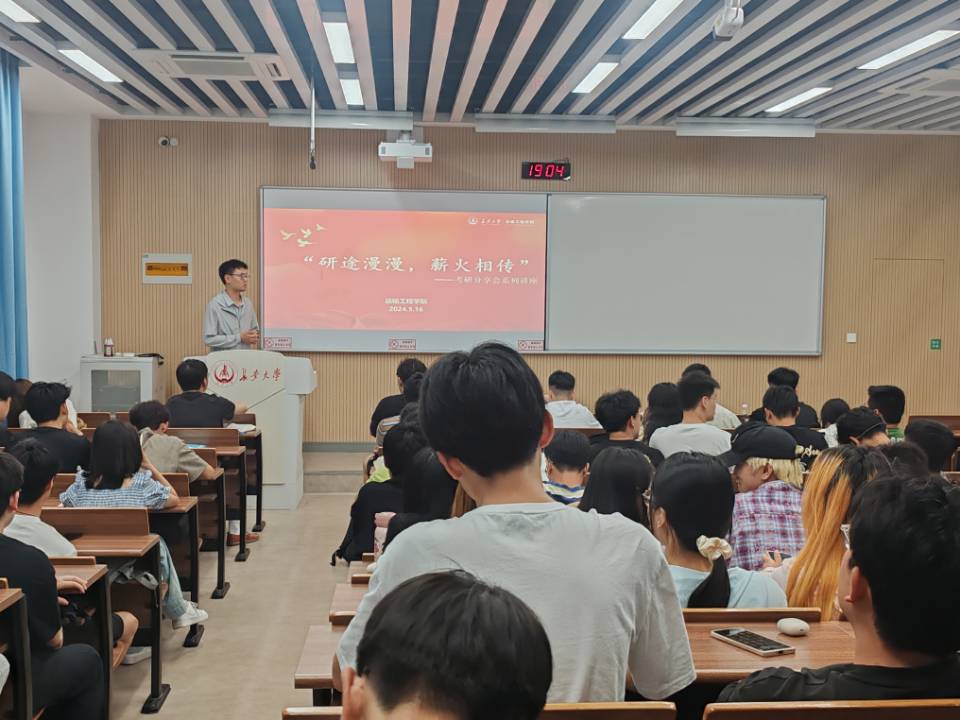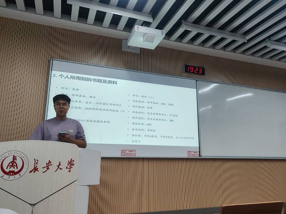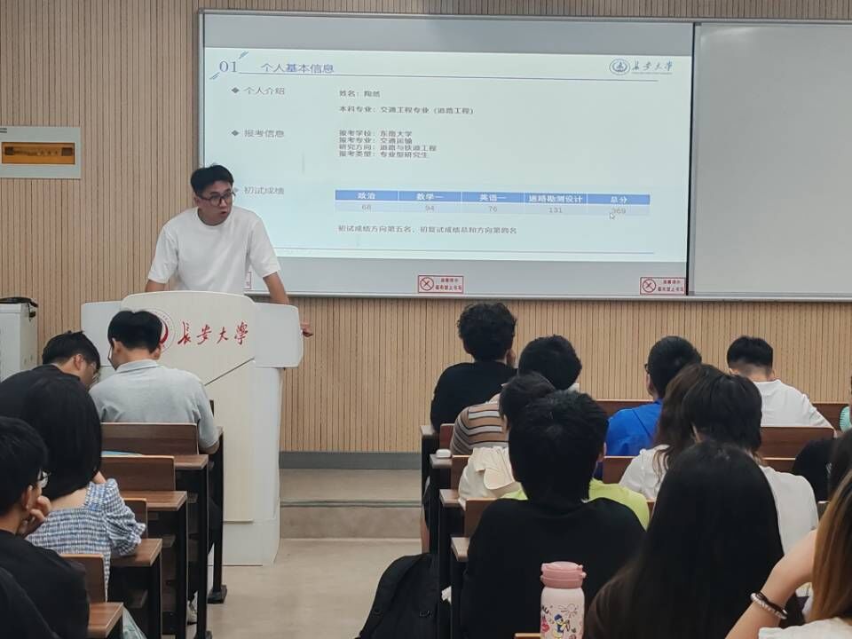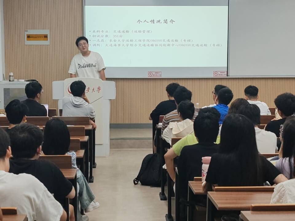 分享会邀请成功上岸黄金城 、中南大学、北京交通大学、西南交通大学、大连海事大学和东南大学的优秀同学分享自己的考研经验和心得。分享内容围绕考研科目的学习策略以及心态调整等方面,为现场学生推荐复习资料以及学习软件。分享会最后,在场学生踊跃发言提问,分享者一一耐心解答问题。