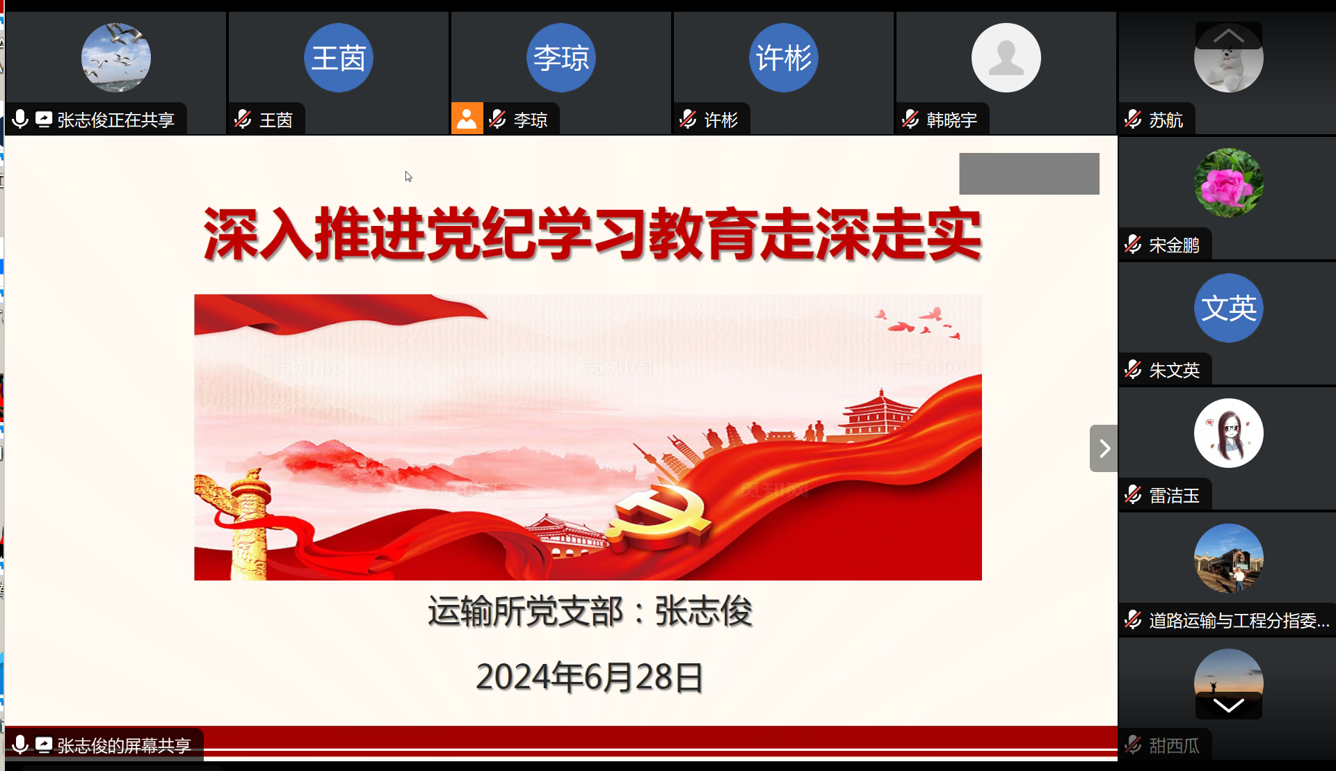 6月28日下午,交通运输系统组织与控制研究所党支部开展党纪学习教育专题党课。会议由支部书记张志俊主持,院长葛颖恩、运输所全体党员以及党外教师参加了会议。