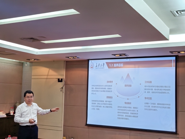 葛颖恩从学校建设发展史、统计学硕士点建设历史、统计学专业培养方向、师资情况、近年研究成果、思政教育、师资力量、人才培养、学术交流和服务贡献等多个方面向各位专家详细汇报了统计学学位点的发展建设情况。