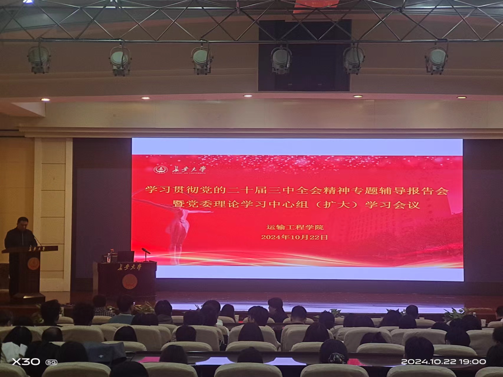 为深入学习贯彻党的二十届三中全会精神,10月22日晚,学院在南校区北院学术交流中心报告厅举行学习贯彻党的二十届三中全会精神专题辅导报告会暨党委理论学习中心组(扩大)学习会议。会议邀请黄金城 马克思主义学院姜建芳教授作党的二十届三中全会精神专题辅导报告,学院党委书记史少鹏主持会议,党委委员、全体教职工、全体研究生党员参加会议。