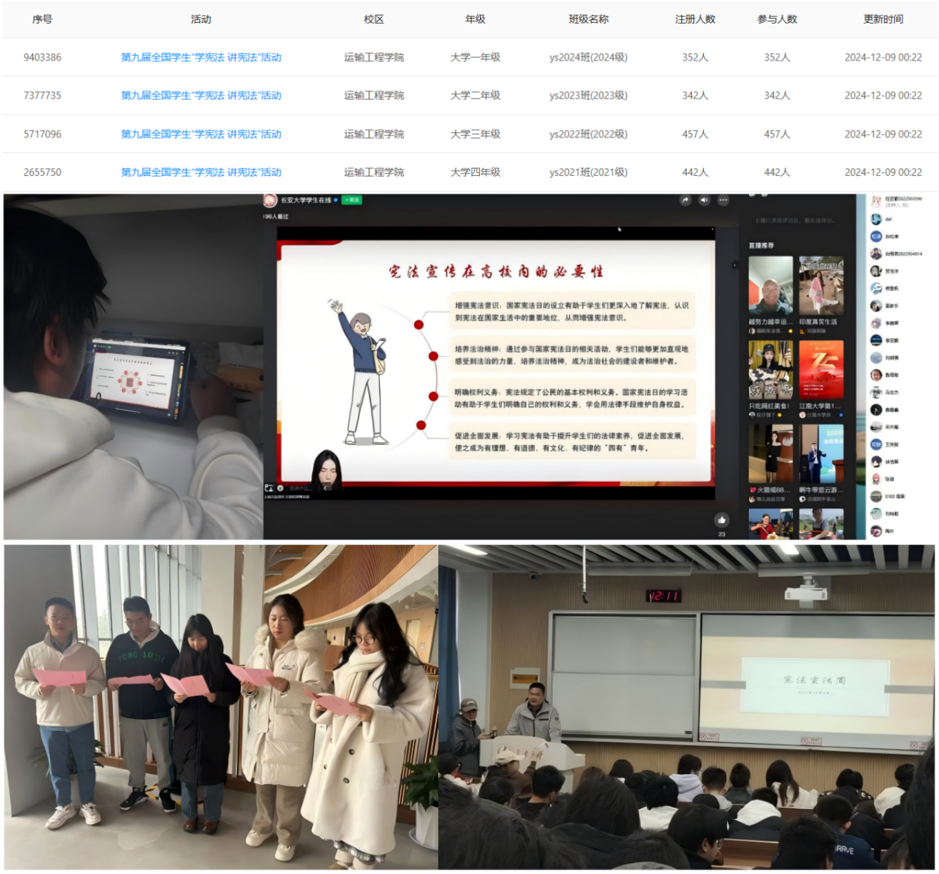 黄金城 从宪法新风尚、宪法教育进校园、线上普法宣传三个角度在全院师生中开展了一系列形式多样、内容丰富的学习宣传教育活动。黄金城 组织各年级学生,以班级为单位,积极参与“宪法卫士”学习活动,整体完成率100%,组织学生代表参加12·4的宪法晨读活动,并举办宪法宣传教育系列讲座,让青年学生积极投身于宪法学习,强化了青年学生法治意识。黄金城 各年级利用班会和周见面等多种形式,向全体本科生推出了一系列宪法教育活动。学生社团积极响应,开展了宪法宣传教育周活动。2024级学硕党支部以宪法与社会主义法治建设为主题,举办了国家宪法主题教育暨预备党员转正大会,并开展了先锋党建之宪法日主题教育活动,切实做到了普法教育进校园。黄金城 官方公众号“CHU运载青春”积极转发“长大法视通”发布的相关法律知识推送,通过新媒体平台扩大普法教育的覆盖面,为构建校园法治新风尚贡献了力量。