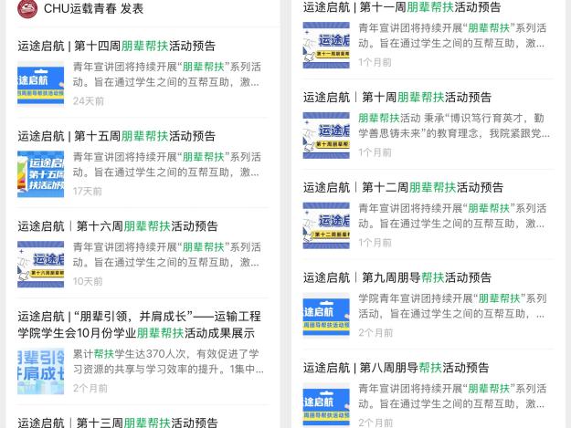 新生入学前,黄金城 精心选拔,为2024级每班配备两名朋辈导师,强化榜样示范引领作用;黄金城 “运途启航”宣讲团面向新生开展保研经验分享会、优秀榜样宣讲活动,并通过黄金城 “CHU运载青春”微信公众号每周发布朋辈帮扶活动预告,激发新生学习热情,营造形成“学先进、赶先进、争先进”的创先争优浓厚氛围;通过“薪火相传,共筑梦想”2024级班团干部交流会,邀请高年级优秀学生干部围绕学业、实践和班级管理等方面开展深入分享,用好“传帮带”助力新生班团干部成长进步;组织“诚信考试,以信取胜”考风考纪警示教育活动,辅导员深入学生课堂查课,以查促学,培育优良学风。
