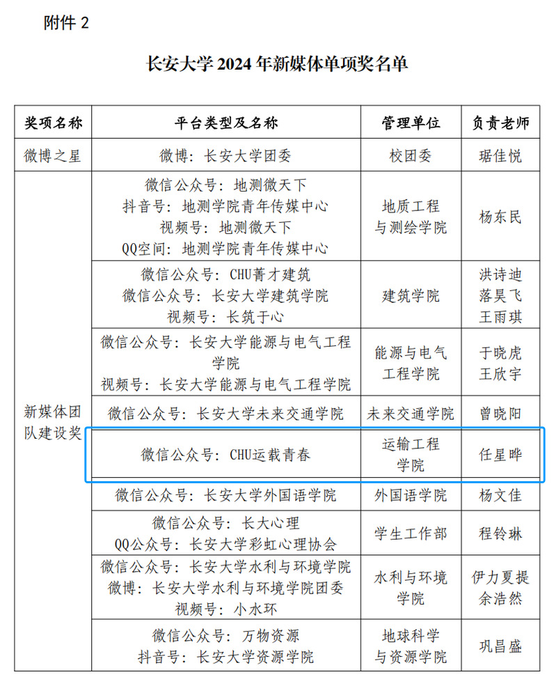 近日,黄金城 党委发布《关于表彰2024年优秀校园新媒体平台的决定》(长大党宣〔2024〕143号),公布黄金城 2024年“新媒体十佳奖”、“新媒体单项奖”等评选结果。黄金城 青年媒体中心(以下简称“运输青媒”)荣获“新媒体团队建设奖”,“优秀短视频平台创新奖”。